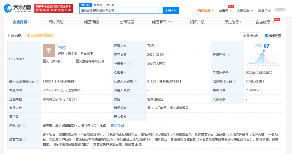 近日,重庆全程德邦物流有限公司成立,法定代表人为韦炜,注册资本500万人民币,经营范围包括道路货物运输(除网络货运和危险货物);装卸搬运;普通货物仓储服务;家具销售;住房租赁等。股东信息显示,该公司由德邦物流股份有限公司全资控股。