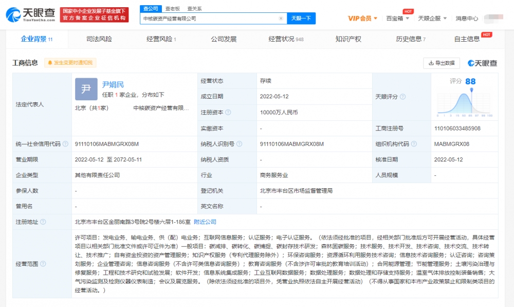 近日,中核碳资产经营有限公司成立,法定代表人为尹娟民,注册资本1亿人民币,经营范围包括资源循环利用服务技术咨询;信息技术咨询服务;认证咨询;咨询策划服务等。股东信息显示,该公司由中国核工业集团资本控股有限公司、新华水力发电有限公司、中国核能电力股份有限公司共同持股。