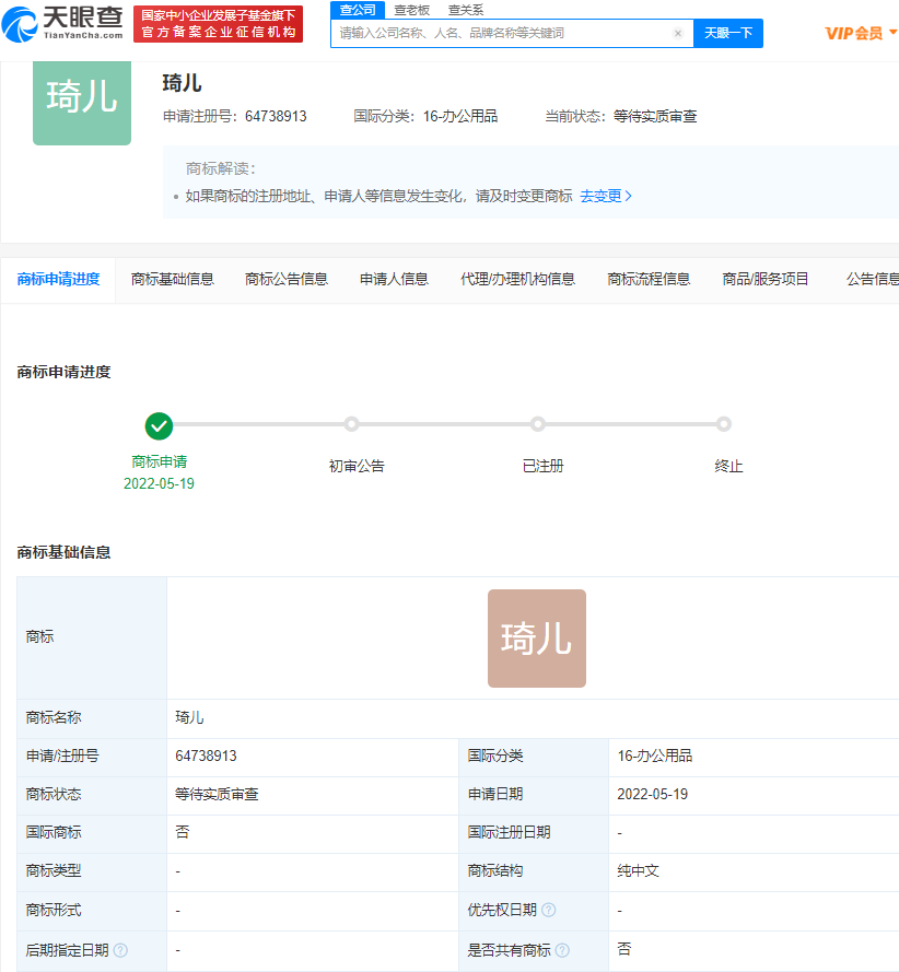 近日,杭州初行传媒有限公司申请注册多个“琦儿”“琦儿 LEO”“QIER”商标,国际分类涉及方便食品、办公用品等,当前商标流程为“申请收文”。