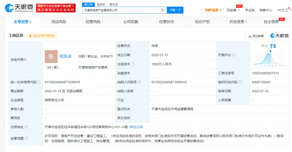 近日,天津铧城房产发展有限公司成立,法定代表人为张凤来,注册资本1000万人民币,经营范围包括房地产开发经营;建设工程施工;住房租赁;园林绿化工程施工;物业管理。股东信息显示,该公司由天津中今房产发展有限公司、康佳集团股份有限公司共同持股。